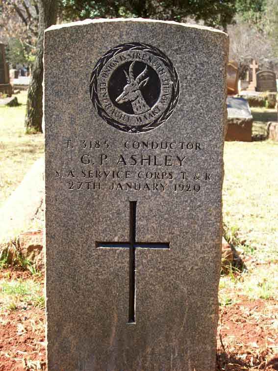 ASHLEY, Conductor, G P, T/3185, South African Service Corps. 27 January 1920. Grave Ref. C.E. 6207. Photo |