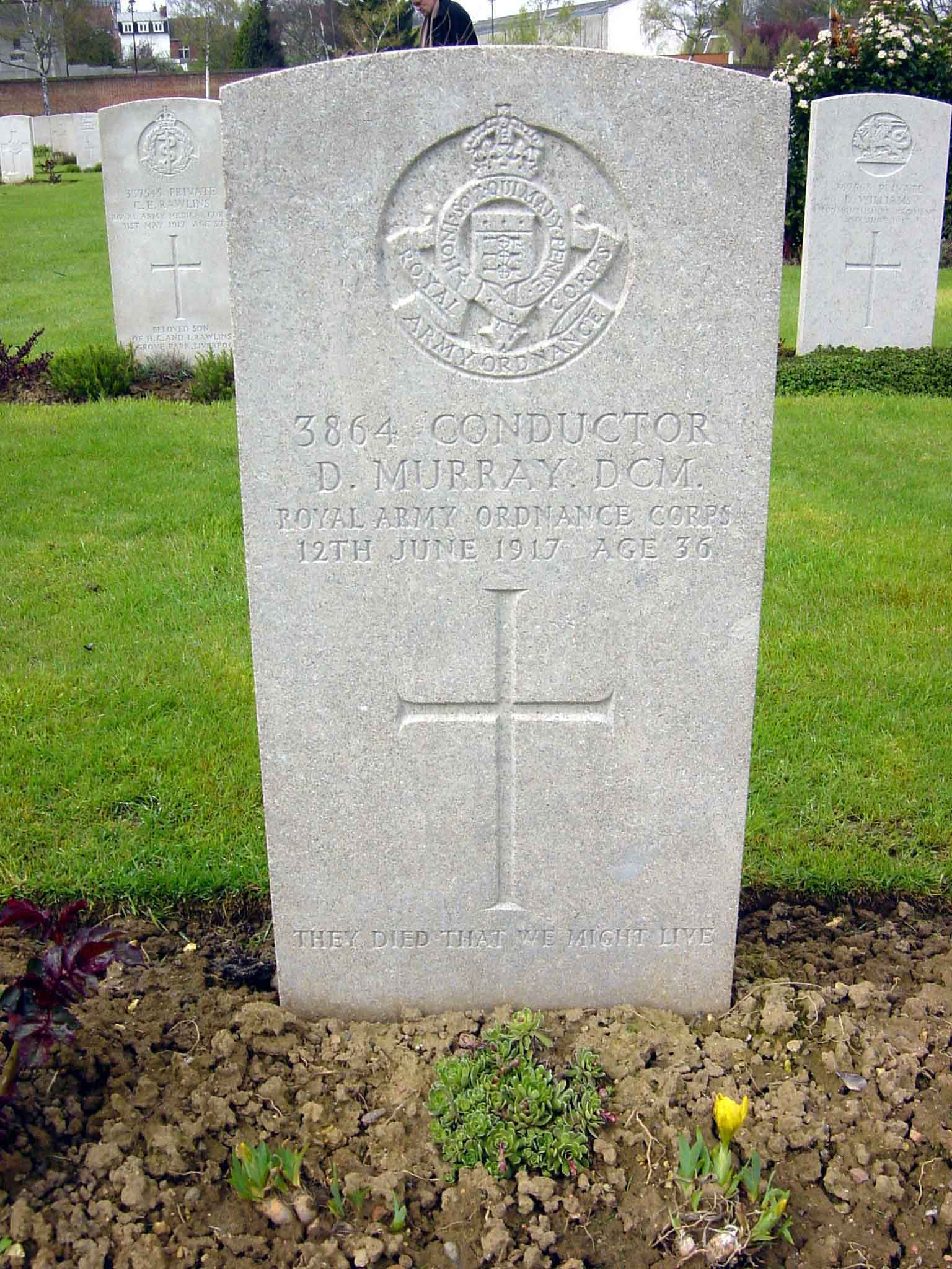 Conductor Daniel MURRAY DCM , 3864, Royal Army Ordnance Corps, attd. 3rd Div., died age 36, on 12 June 1917, Son of the late John and Ellen Louisa Murray. Born at Leeds. Remembered with honour FAUBOURG D'AMIENS CEMETERY, ARRAS. Commemorated in perpetuity by the Commonwealth War Graves Commission.